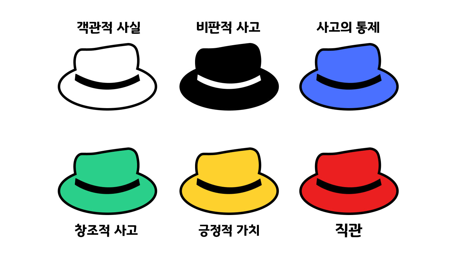 각자 색깔의 모자에 해당하는 사고를 하며 발언합니다.* 사고의 훈련과 토의 기술이 습득되면 모자 없이 토의를 진행해도 좋습니다.